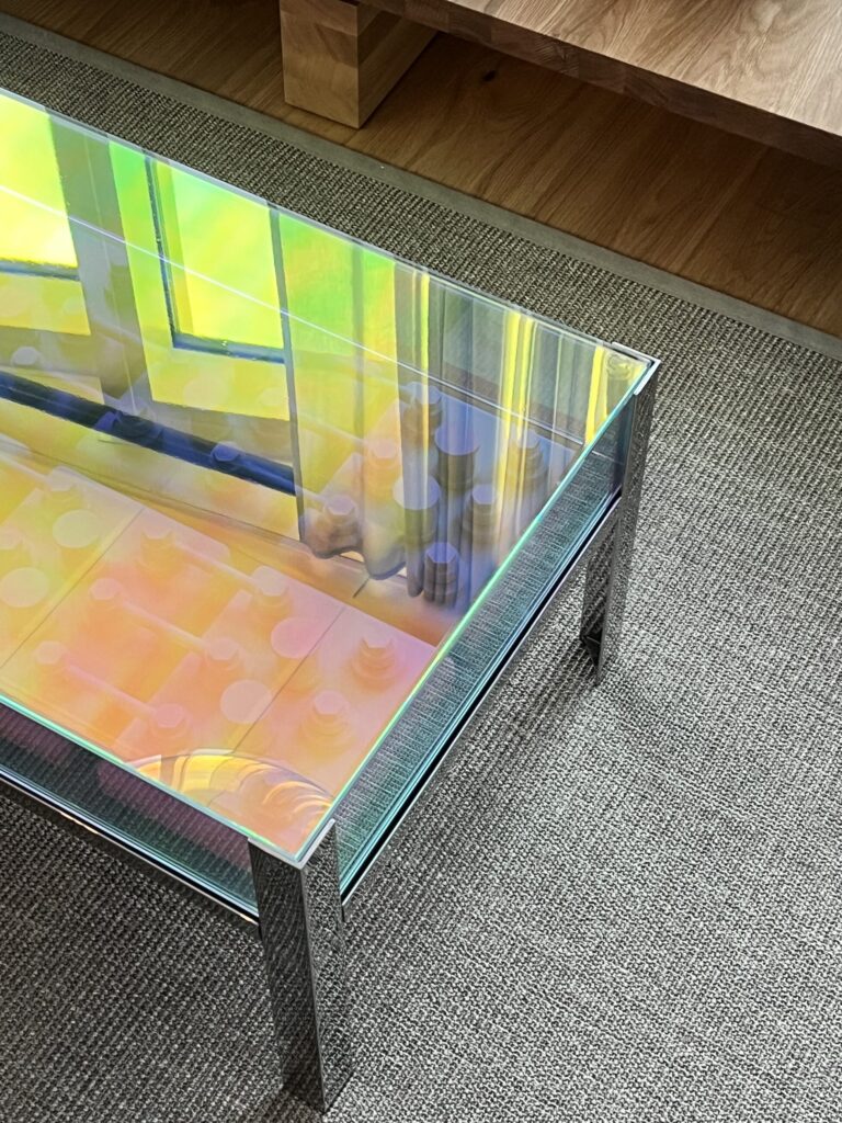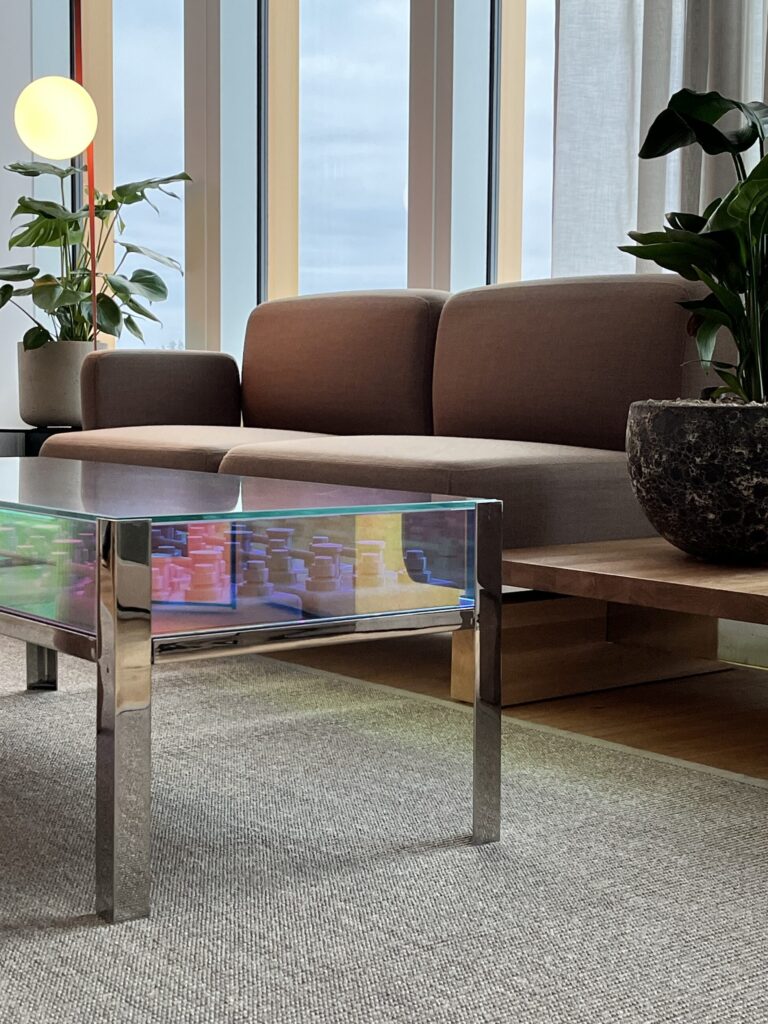 För att lyfta fram Coromatics tekniska expertis specialritades ett soffbord med 3D-printade representationer av batteripackstoppar från Coromatics reservkraftläggningar.